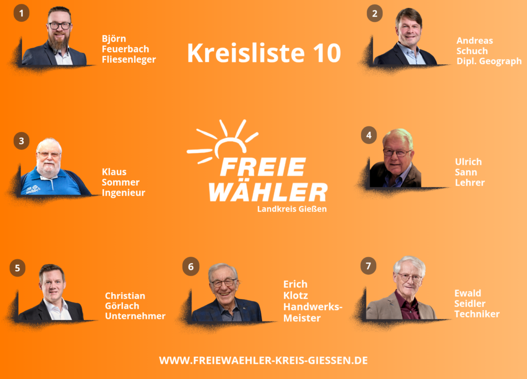 Wir freuen uns, dass Sie den Weg auf unsere Homepage gefunden haben. Wir werden Sie an dieser Stelle regelmäßig über unsere politische Arbeit im Landkreis Gießen informieren. Wir, die Partei FREIE WÄHLER, sind vor Ort für Sie da.